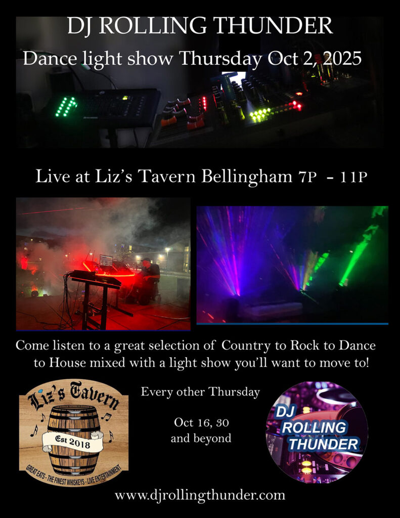 We have a new venue! Liz’s Tavern Bellingham Ma. Thursday Oct, 02 2025, 7PM to 11PM and every other Thursday going forward. We will have a full light show! <Event Link Click Here>
